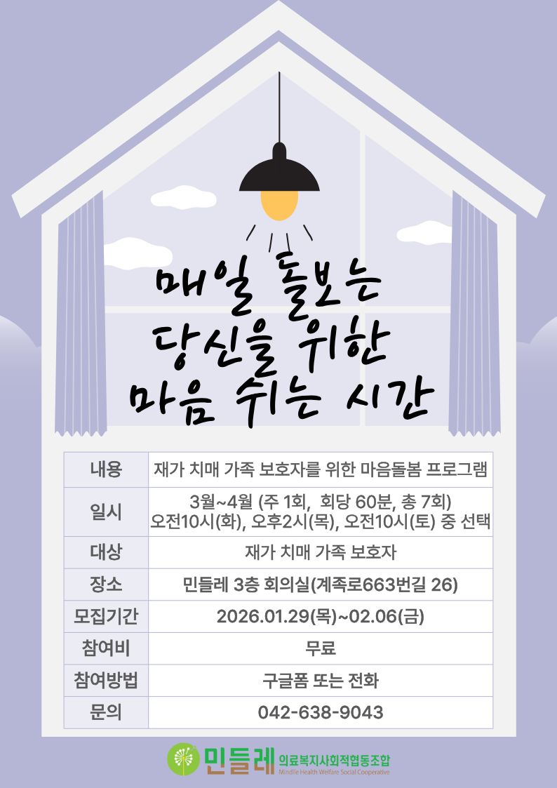 | 작성자 | 민들레의료복지사회적협동조합(mindlle) | 작성일 | 2026-01-29 | 조회수 | 172 |